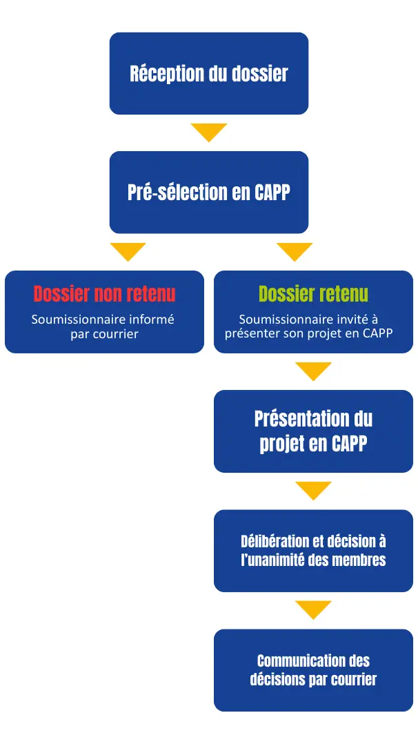 Le dossier est accepté pour un passage en commission s’il est déposé complet, c’est-à-dire dûment rempli et signé sur la base du dossier de candidature et conformément à la notice d’information.